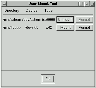 This program makes it easy to mount and unmount filesystems. It will display Mount and Format buttons for each filesystem in /etc/fstab that has been configured with the user option. In Figure 2, the CD-ROM drive has been mounted (and can be unmounted with a click of the Unmount button). The Format button is active for all writeable, unmounted media, and will format the media when pressed.